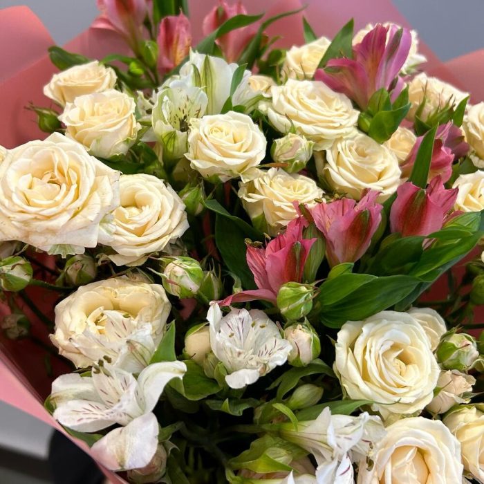 Альстромерия – 6 шт.Роза кустовая – 5 шт.Зелень – 3 шт.Лента атласная – 2 шт.Упаковка дизайнерская – 3 шт.