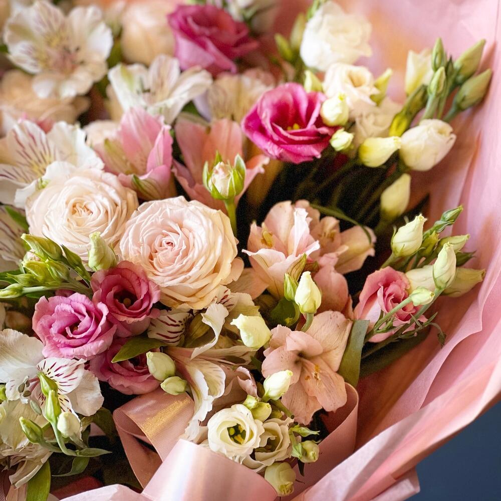 Красивый нежный букет из кустовой розы, альстромерии, эустома на день рождения, без повода