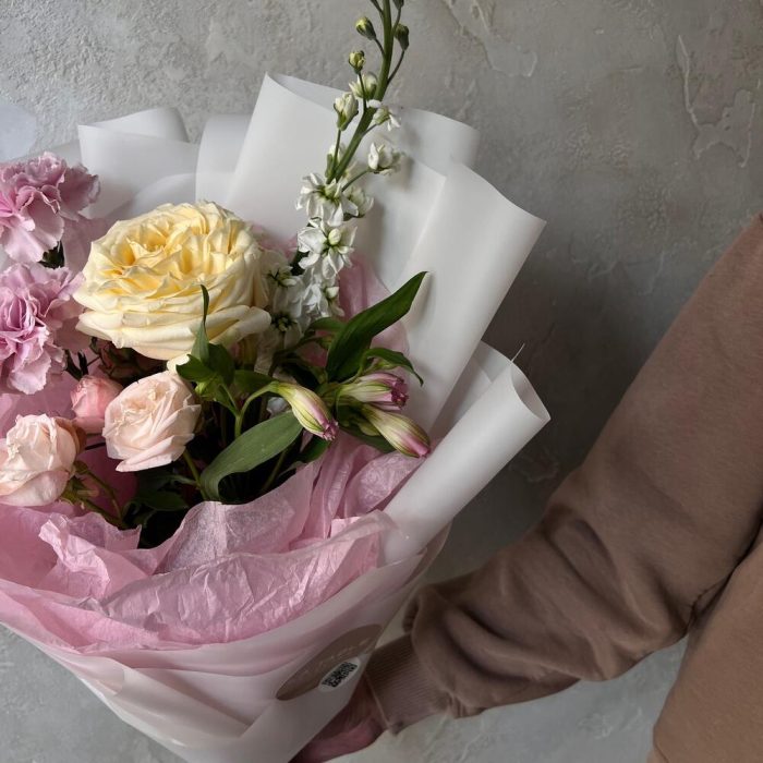 Альстромерия – 1 шт.Маттиола – 1 шт.Роза кустовая – 1 шт.Упаковка дизайнерская – 1 шт.Одноголовая роза – 1 шт.