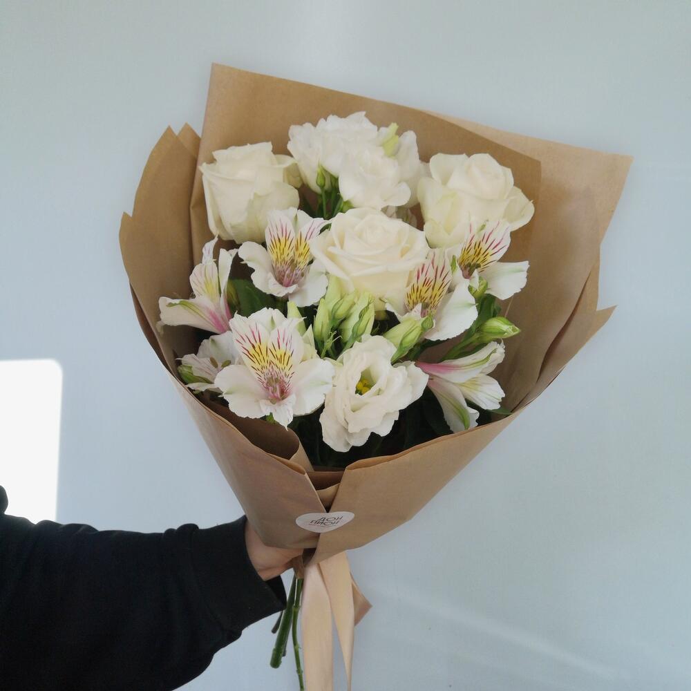 Роза Венделла – 3 шт.Альстромерия белая – 2 шт.лизиантус росита вайт – 2 шт.Упаковка крафт – 1 шт.Лента атласная – 1 шт.