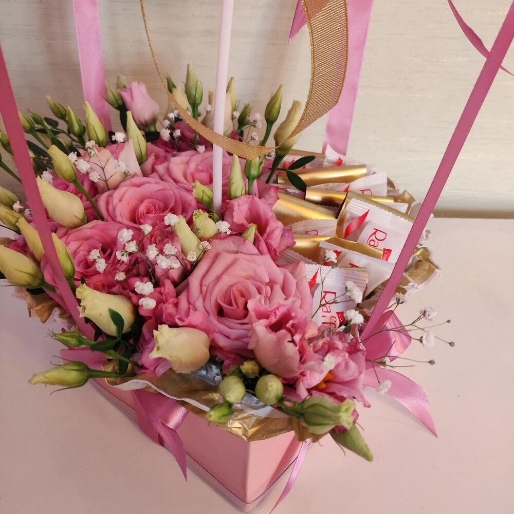 “Сладкое сердце ” – цветочная композиция с сладостями в коробке “Сердце”