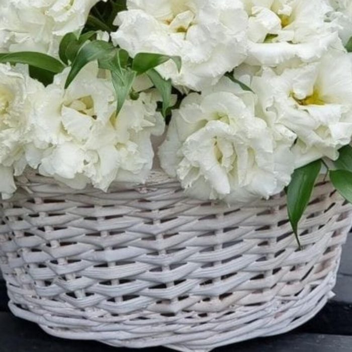 Лизиантус – 19 шт.Оазис флористический – 2 шт.Фисташка пучок – 1 шт.Корзина плетеная – 1 шт.