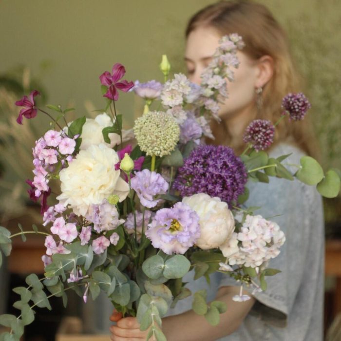 Лавандовый раф - Букет с пионами и луком