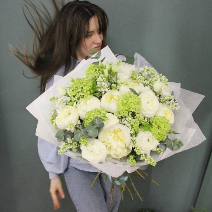 Лизиантус – 3 шт.Пион – 7 шт.Сирень – 4 шт.Эвкалипт – 7 шт.Упаковка – 1 шт.Калина – 4 шт.