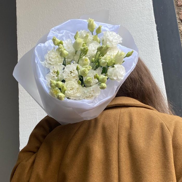 лизиантус махровый белый – 7 шт.Тишью – 2 шт.Упаковка дизайнерская – 4 шт.лента атласная брендированная – 1 шт.
