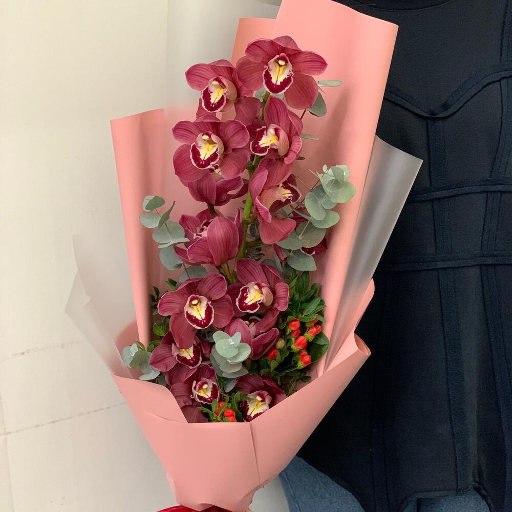 Орхидея Цимбидиум – 1 шт.эвколиптом – 1 шт.Гиперикум – 1 шт.Дизайнерская упаковка – 3 шт.