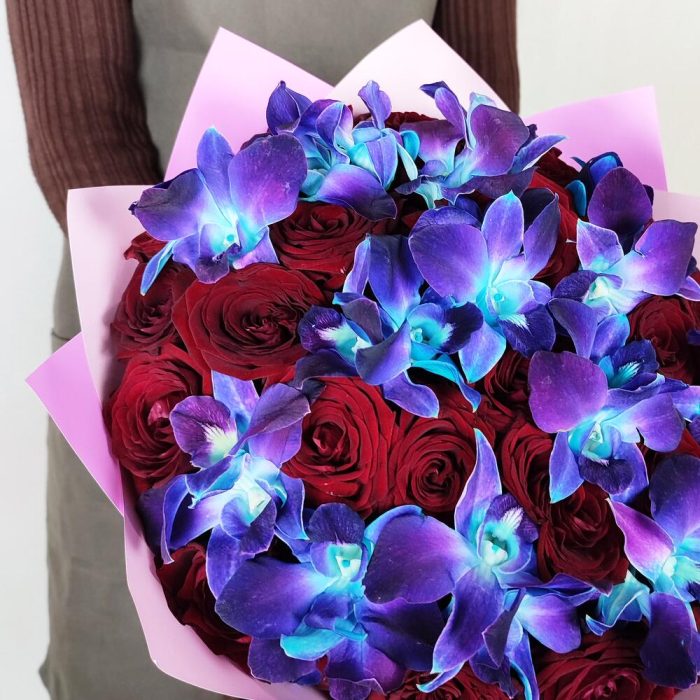 Красные розы с космическими орхидеями XL. Букет 142 ALMOND ROSES