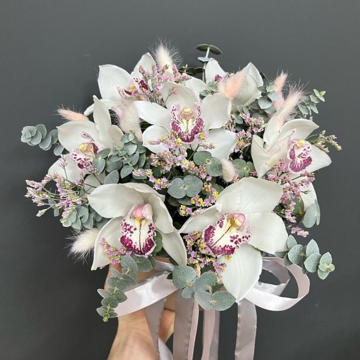 Эвкалипт – 5 шт.Лимониум розовый – 3 шт.Оазис флористический – 1 шт.удлинитель для орхидея – 7 шт.орхидея премиум цимбидиум – 7 шт.шляпная коробка нюдовая – 1 шт.