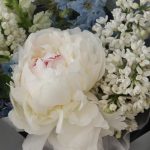 Дельфиниум – 2 шт.Пион – 1 шт.Твидия – 1 шт.Львиный зев – 2 шт.Маттиола – 2 шт.Эвкалипт – 2 шт.Тишью – 1 шт.Упаковка дизайнерская – 3 шт.Лента – 1 шт.