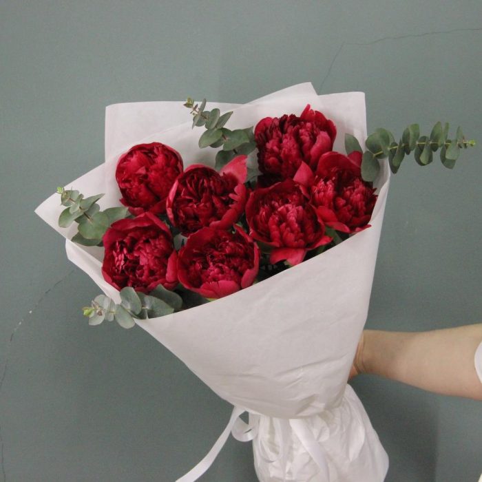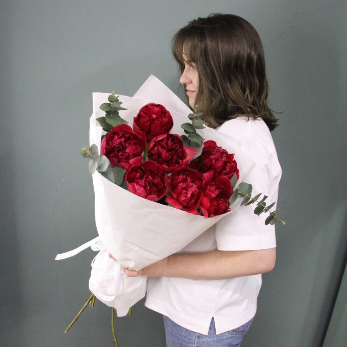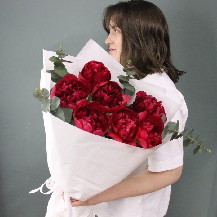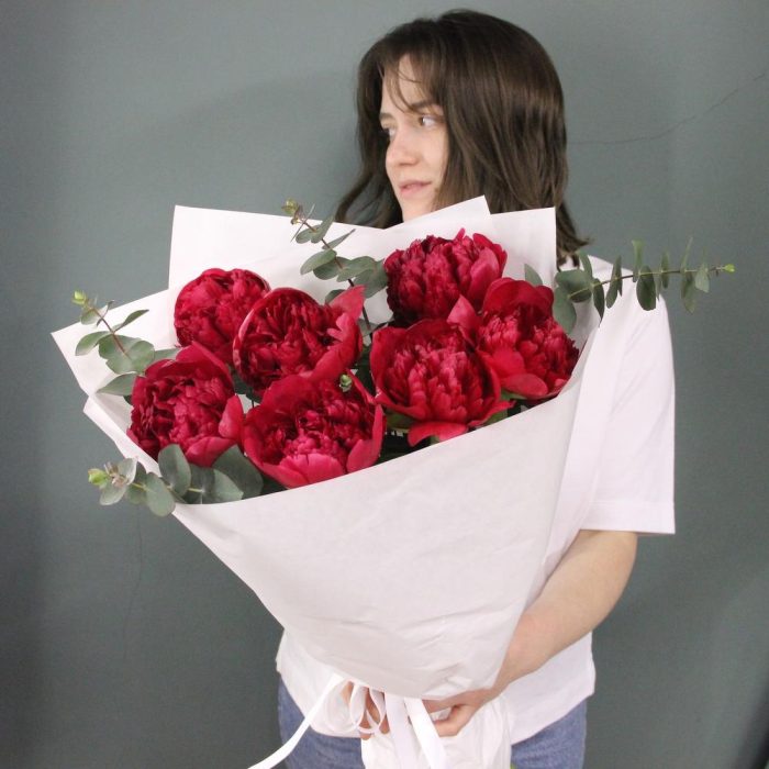 Алый – букет из пионов и эвкалипта