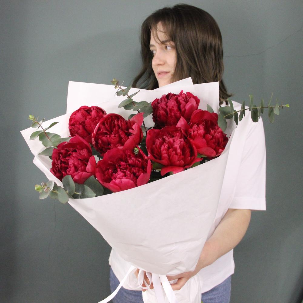 Алый - букет из пионов и эвкалипта