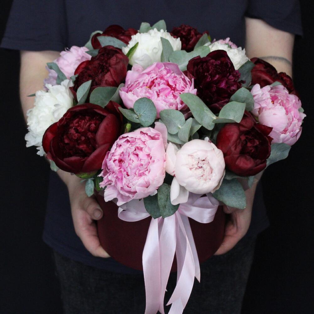Пион Сара Бернар – 5 шт.Пион Ред Шарм – 6 шт.Пион белый – 4 шт.Оазис флористический – 1 шт.Шляпная коробка – 1 шт.Лента атласная – 2 шт.Эвкалипт Baby Blue – 5 шт.