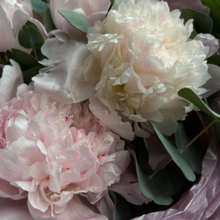 Атласная лента – 1 шт.декоративная упаковка – 1 шт.пионы – 5 шт.Эвкалипт – 3 шт.