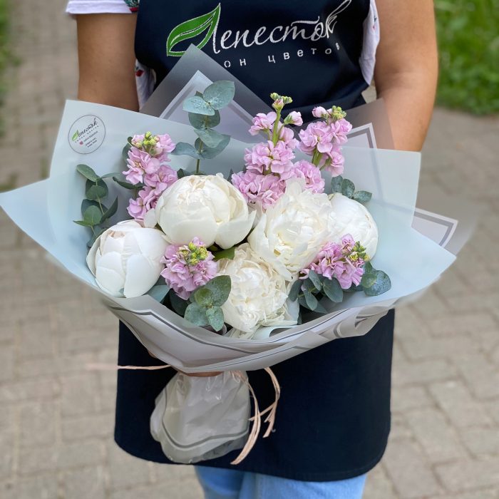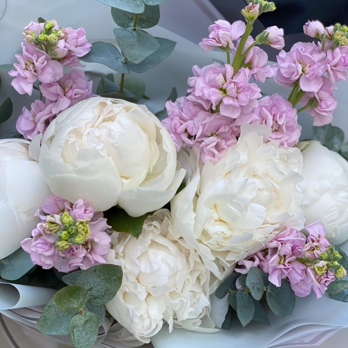 Авторский букет с розами Мента, пионовидными кустовыми розами, маттиолой и эустомой