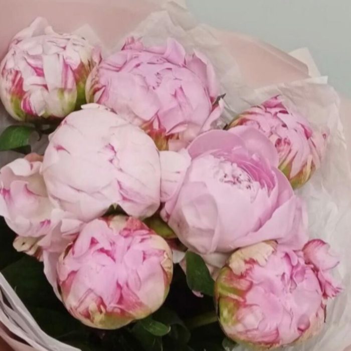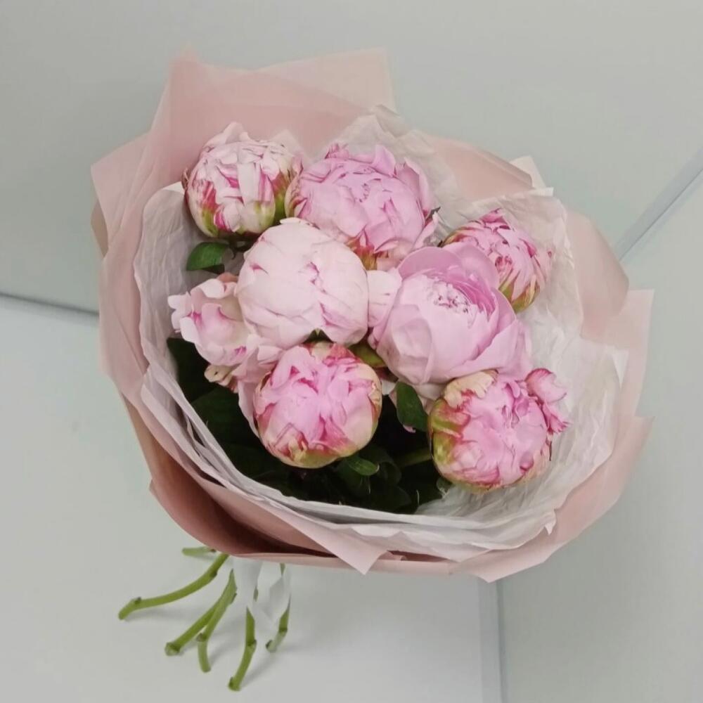 Лента атласная – 1 шт.Упаковка дизайнерская – 4 шт.пионы сара бернар – 7 шт.