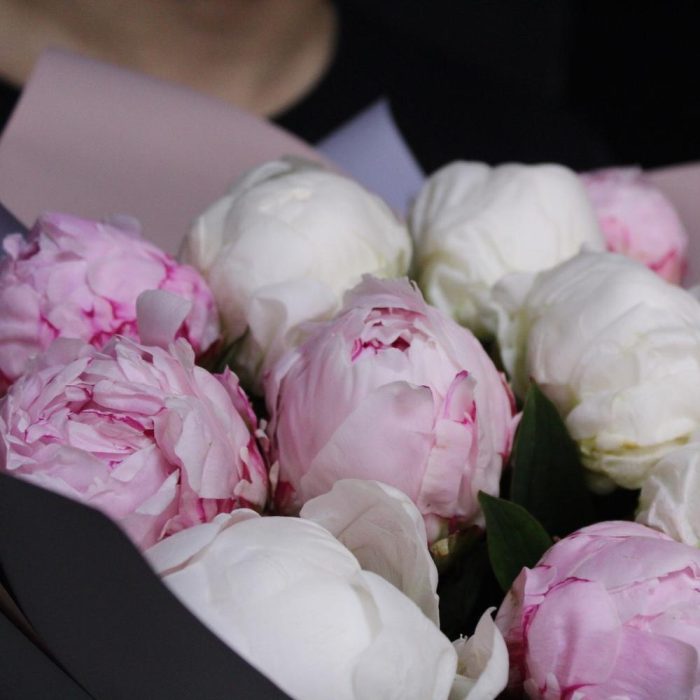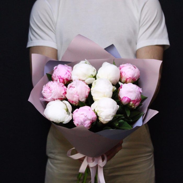 Лента атласная – 2 шт.Пион белый – 5 шт.Пион розовый – 6 шт.Пленка матовая – 2 шт.