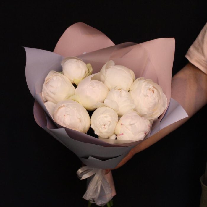 Лента атласная – 1 шт.Пион белый – 9 шт.Пленка дизайнерская – 4 шт.