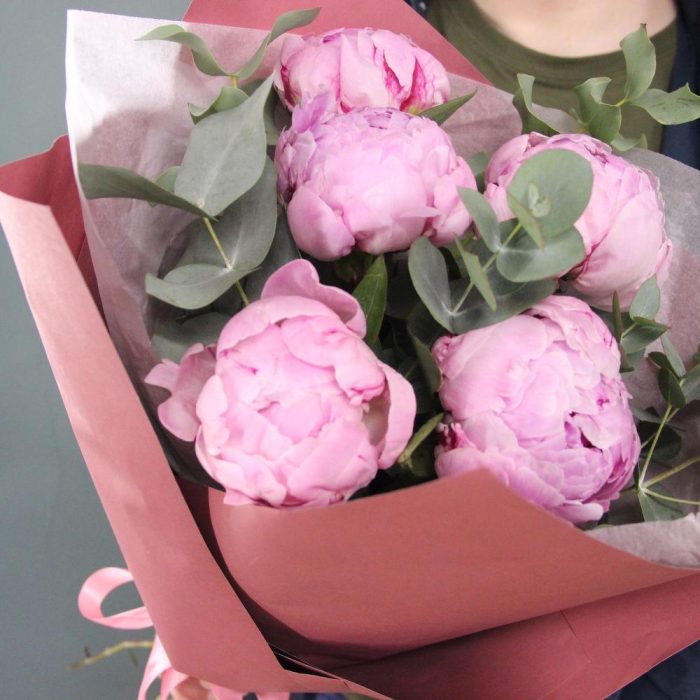 Пион – 5 шт.Эвкалипт – 4 шт.Лента атласная – 1 шт.Тишью – 1 шт.Бумага – 2 шт.