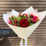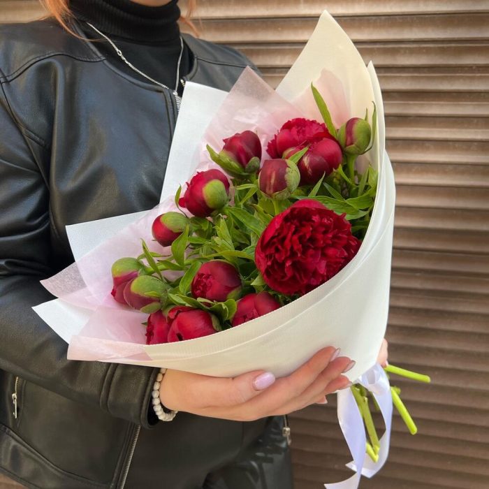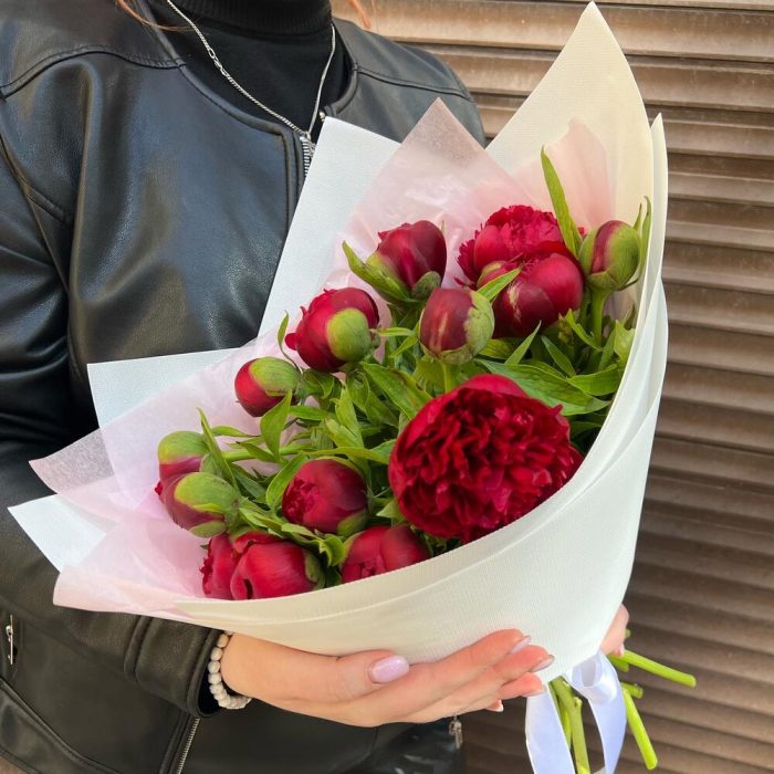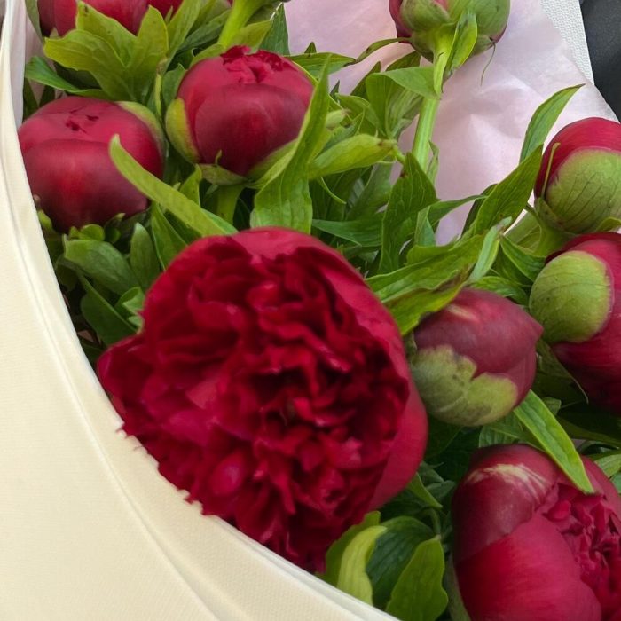 Супер яркие пионы, букет очень эффектный и красивый. Пионы раскрываются по очереди и хорошо стоят .