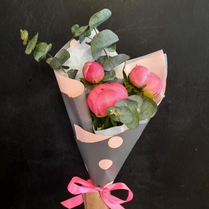 Пион Коралл Шарм (Coral Charm) – 3 шт.Эвкалипт – 1 шт.Упаковка дизайнерская – 1 шт.