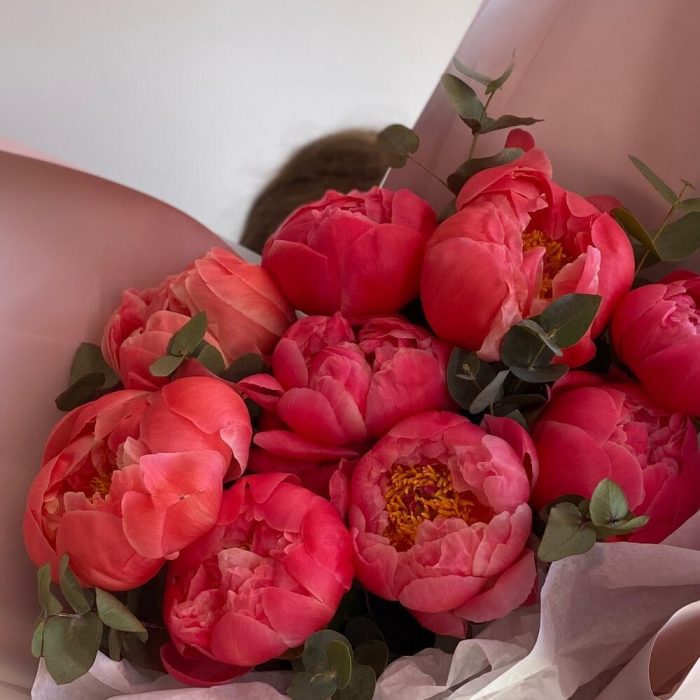 пионы Коралл шарм – 9 шт.Эвкалипт – 6 шт.Пленка дизайнерская – 5 шт.Лента атласная – 2 шт.Тишью белое – 2 шт.инструкция по уходу за цветами – 1 шт.Кризал (подкормка) – 1 шт.