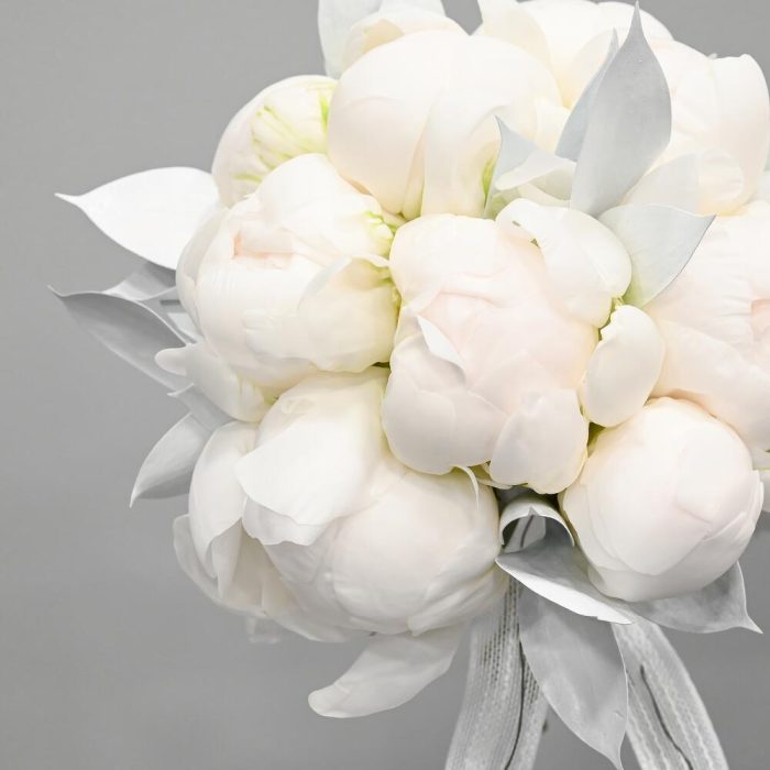 Элегантный свадебный букет в белой цветовой гамме из 9 пионов перевязанных декоративной лентой.Флористы студии Цветочный Этикет собрали его из самых свежих цветов. Букет готов сиять красотой на всех фотография.