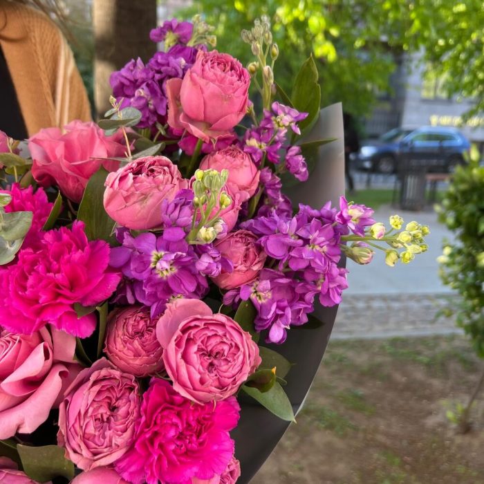 Маттиола – 7 шт.Роза пионовидная – 2 шт.Гвоздика – 8 шт.Роза кустовая – 3 шт.Эвкалипт – 2 шт.уракрвка дизайнерская – 1 шт.Зелень – 1 шт.