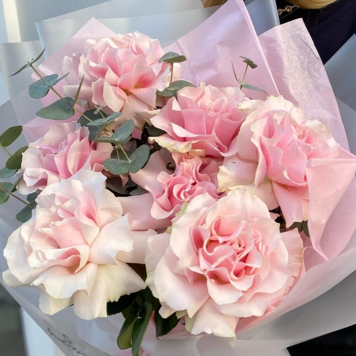 Эвкалипт – 1 шт.Тишью – 2 шт.Роза розовая – 7 шт.Пленка матовая – 1 шт.