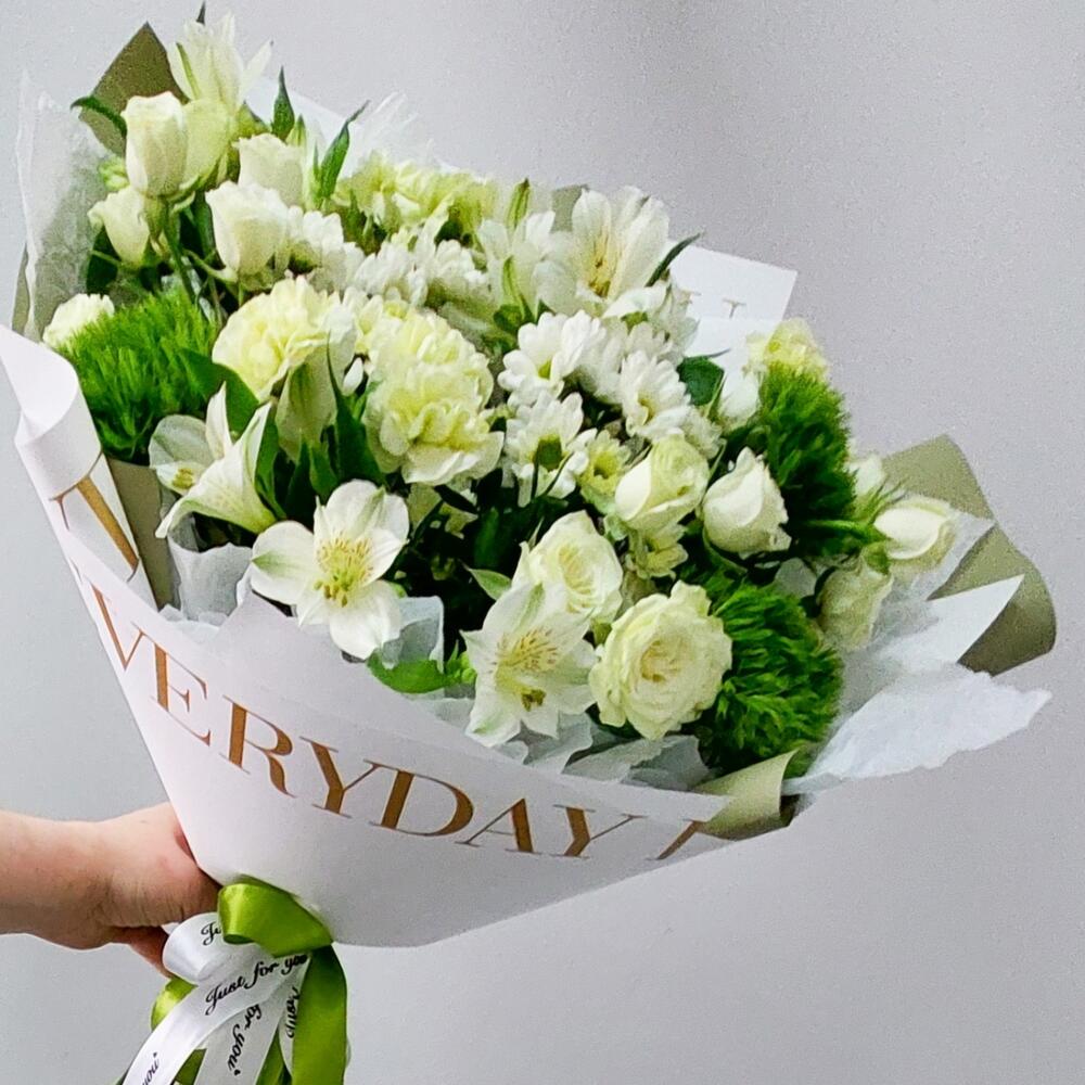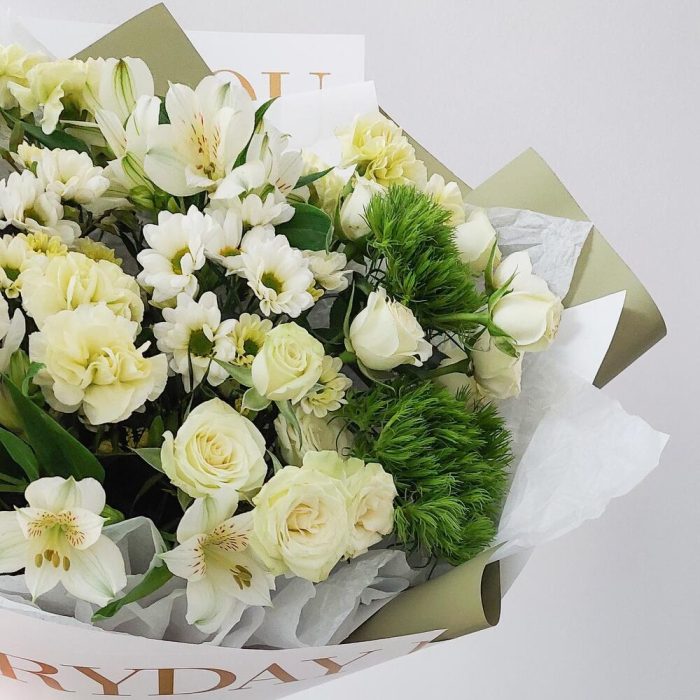 Зелень – 3 шт.Лента атласная – 2 шт.Тишью – 2 шт.Роза кустовая белая – 3 шт.Сантини – 3 шт.Упаковка дизайнерская – 2 шт.Открыточка с вашими пожеланиями – 1 шт.эустома белая – 2 шт.Гвоздика green trick – 3 шт.гвоздика белая сортовая – 3 шт.транспортировочная упаковка – 1 шт.