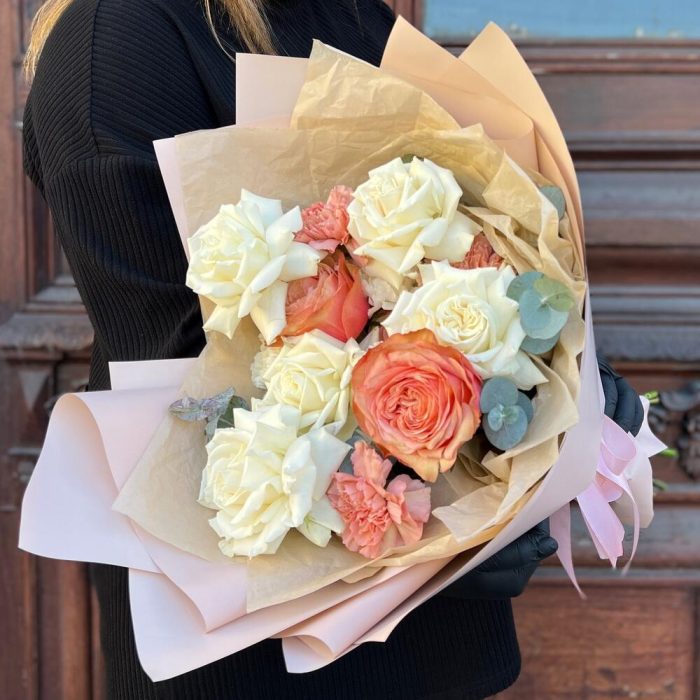 Эвкалипт – 3 шт.Лента атласная – 2 шт.Тишью – 3 шт.Диантус – 6 шт.Пленка матовая – 5 шт.Роза пионовидная кахала – 3 шт.роза пионовидная плайя бланка – 5 шт.