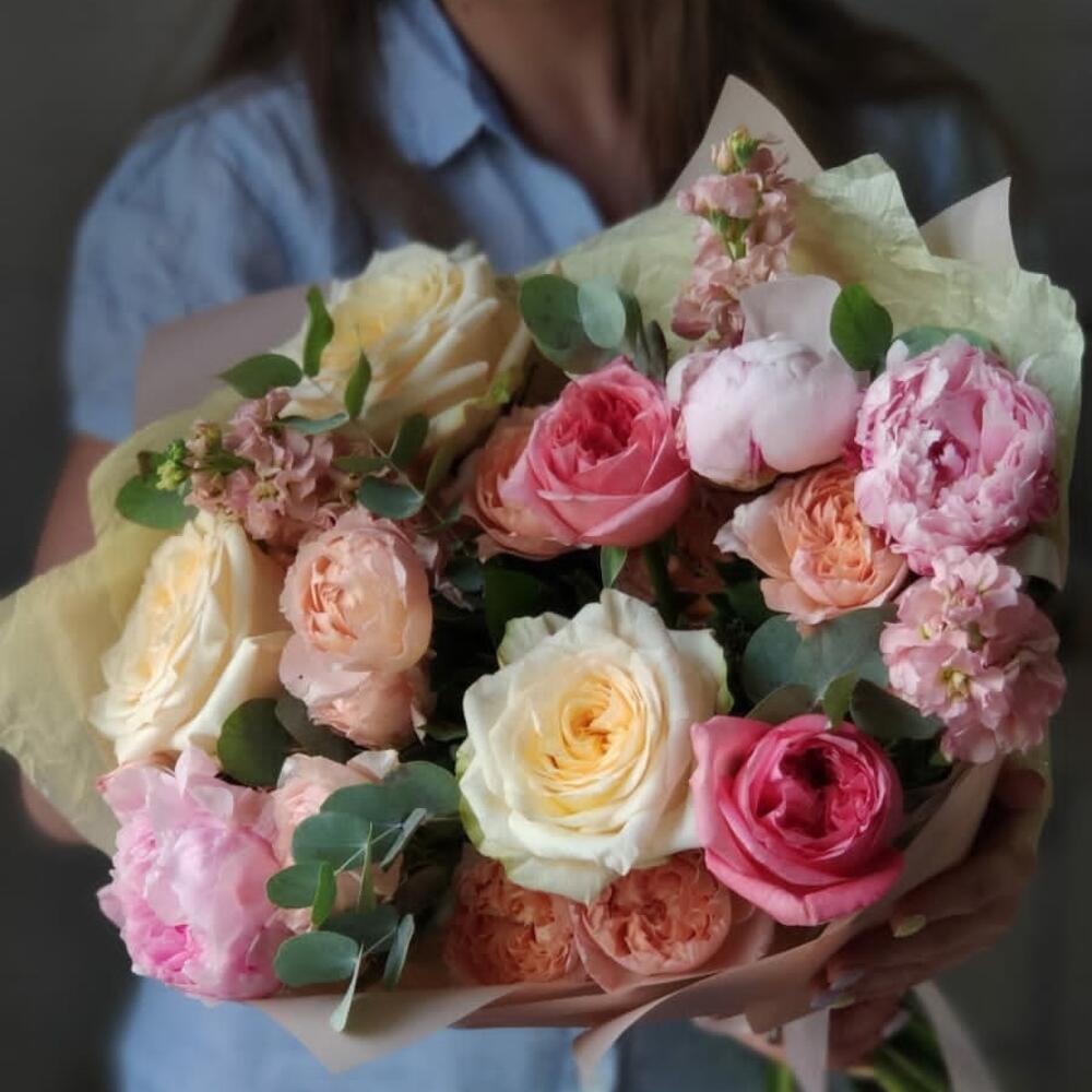 Маттиола – 3 шт.Пион – 3 шт.Роза кустовая – 2 шт.Эвкалипт – 2 шт.Роза Эквадор – 5 шт.Упаковка – 1 шт.