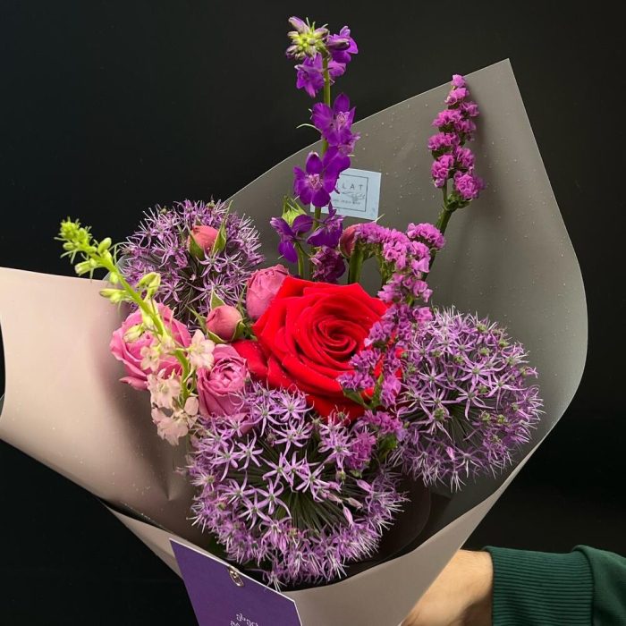 Роза Эксплорер – 1 шт. Луковичные растения – 3 шт. Пионовидная кустовая роза – 1 шт. Лимониум – 2 шт. Упаковка дизайнерская – 1 шт. инструкция по уходу за цветами – 1 шт. Открытка – 1 шт.