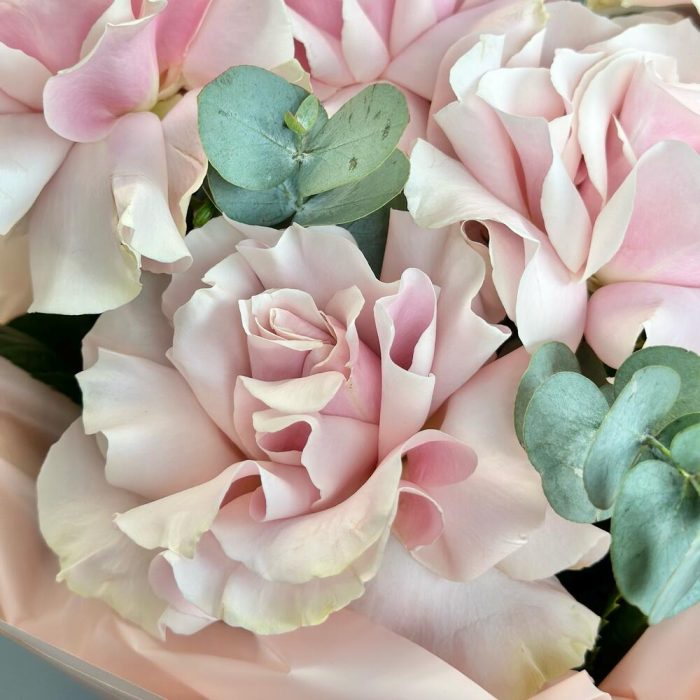 Лента атласная – 1 шт.Французская роза – 5 шт.Дизайнерская упаковка – 1 шт.эвкалипт цинерея пучок – 1 шт.влагостойкий тишью – 1 шт.