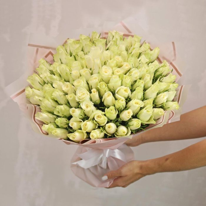 Букет из 101 белой розы 35-40 см (Кения) в стильной упаковке