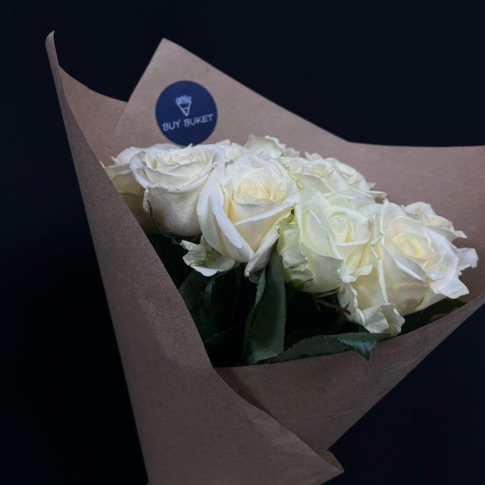 белая роза – 11 шт.Крафт бумага – 1 шт.Лента атласная – 1 шт.
