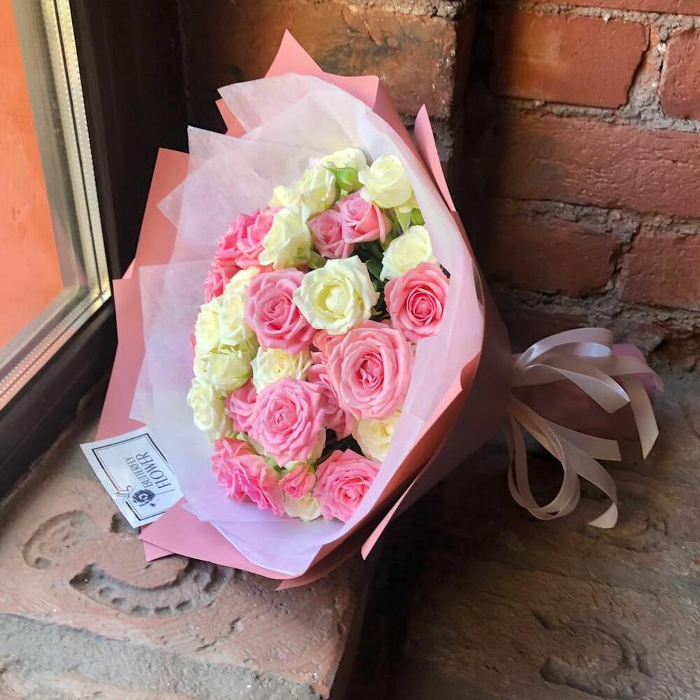 Букет из 15 белых и розовых кустовых роз “Розовый туман”