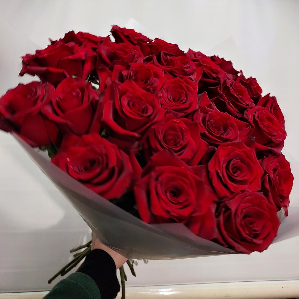 Букет из 25 красных роз в стильной упаковке "Взрывной красный"