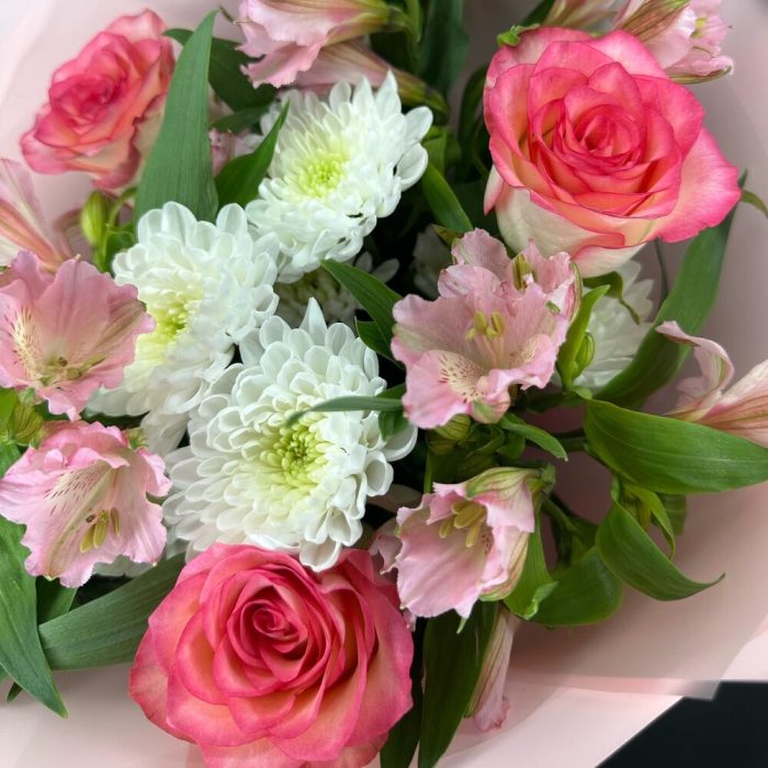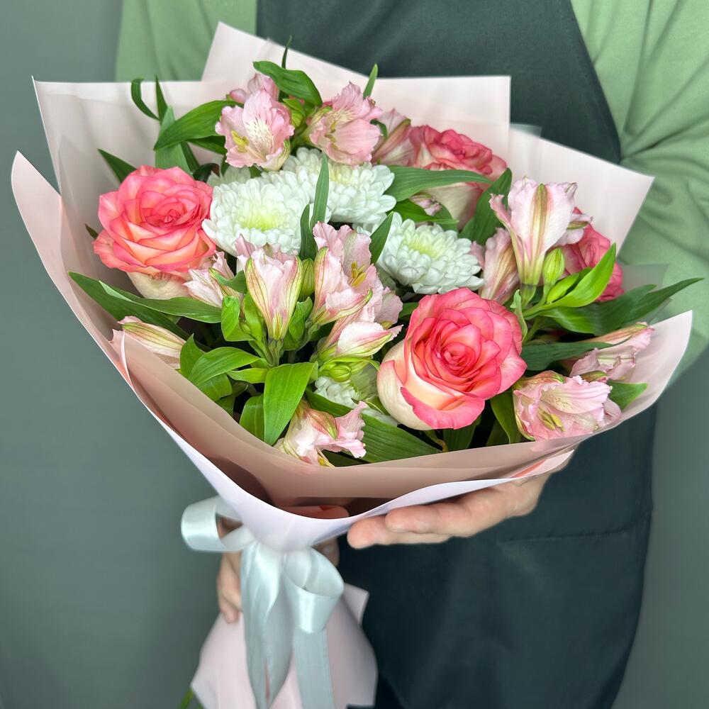 Букет из альстромерий, роз и кустовой хризантемы