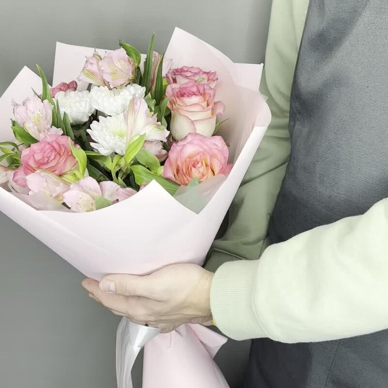 Альстромерия – 3 шт.Хризантема кустовая – 1 шт.Лента атласная – 1 шт.Упаковка дизайнерская – 1 шт.Роза одноголовая эквадор 50 см – 5 шт.