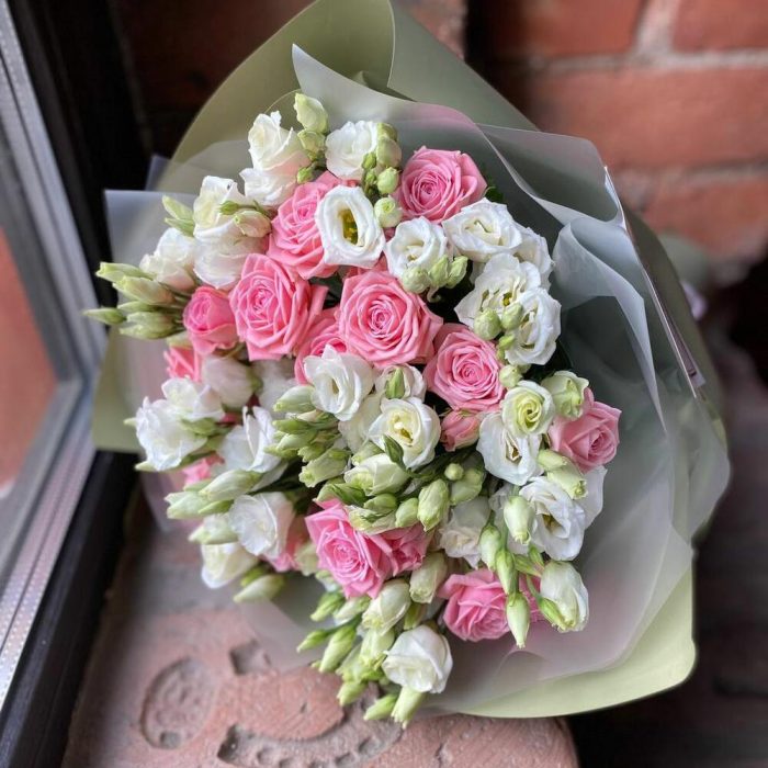 Букет из белой эустомы и кустовой пионовидной розы в дизайнерской упаковке “Бомбастик”