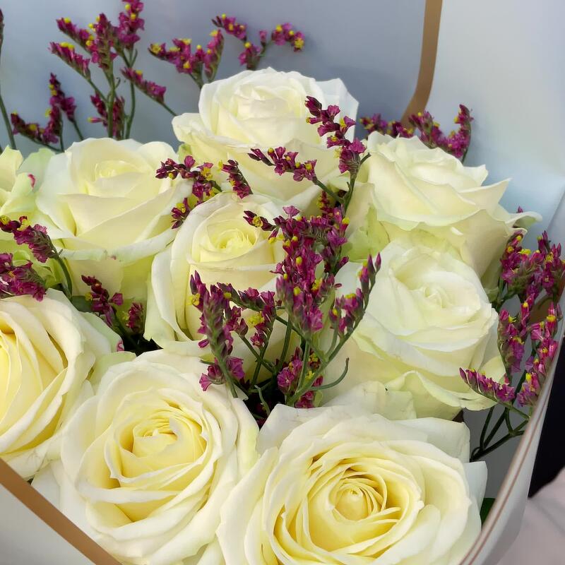Белая роза 50 см – 9 шт.Лимониум – 1 шт.Упаковка дизайнерская – 1 шт.Лента атласная – 1 шт.