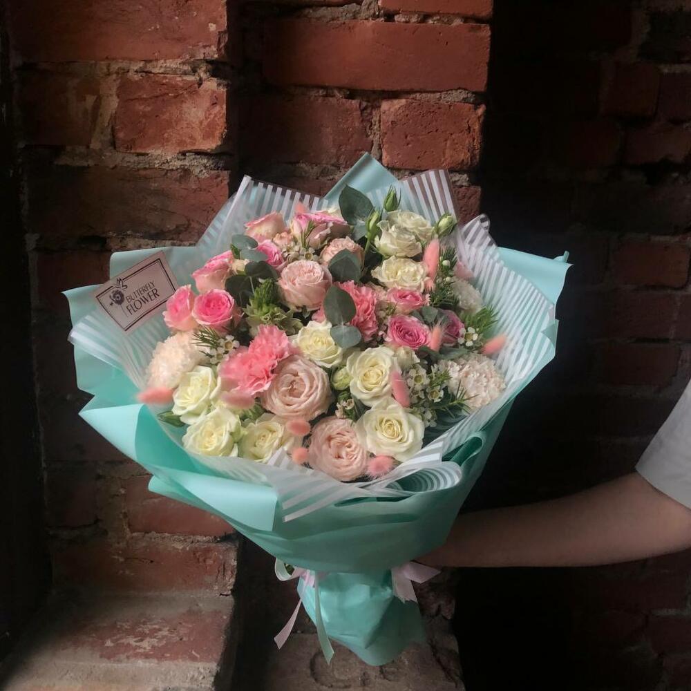 Букет из диантусов, ваксфлауэра, эвкалипта, кустовых роз, орнитогалума, лагуруса, эвкалипта и кустовых пионовидных роз “Савона”