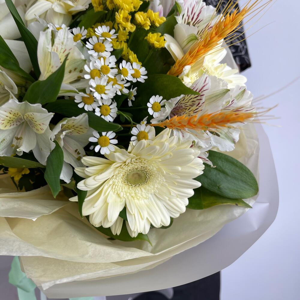 Гербера – 3 шт.Роза – 1 шт.Альстромерия – 3 шт.Сантини – 2 шт.Матрикария – 1 шт.Пшеница (сухоцвет) – 2 шт.Рускус – 5 шт.