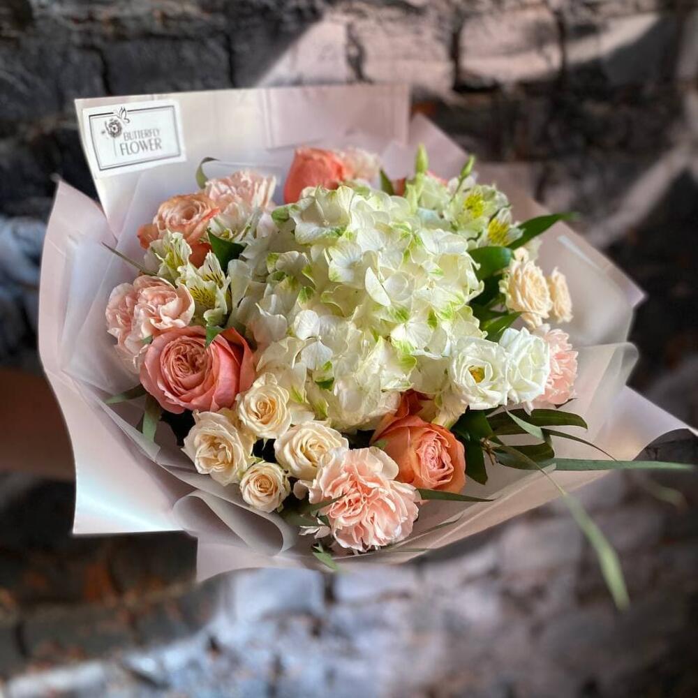 Букет из гортензии, пионовидной розы, эустомы, диантуса, кустовой розы и альстромерии “Летняя нежность”