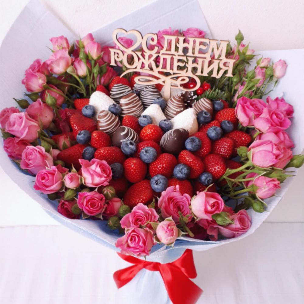 Клубника – 40 шт.Клубника в шоколаде callebaut (бельгия) – 28 шт.Кустовая роза – 9 шт.