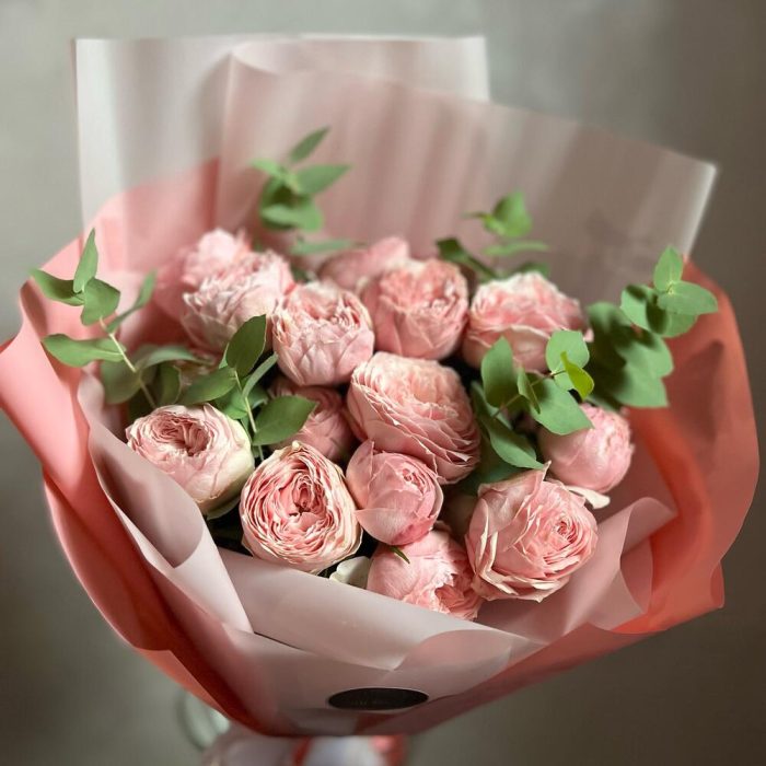 Букет из кустовой пионовидной розы и эвкалипт
