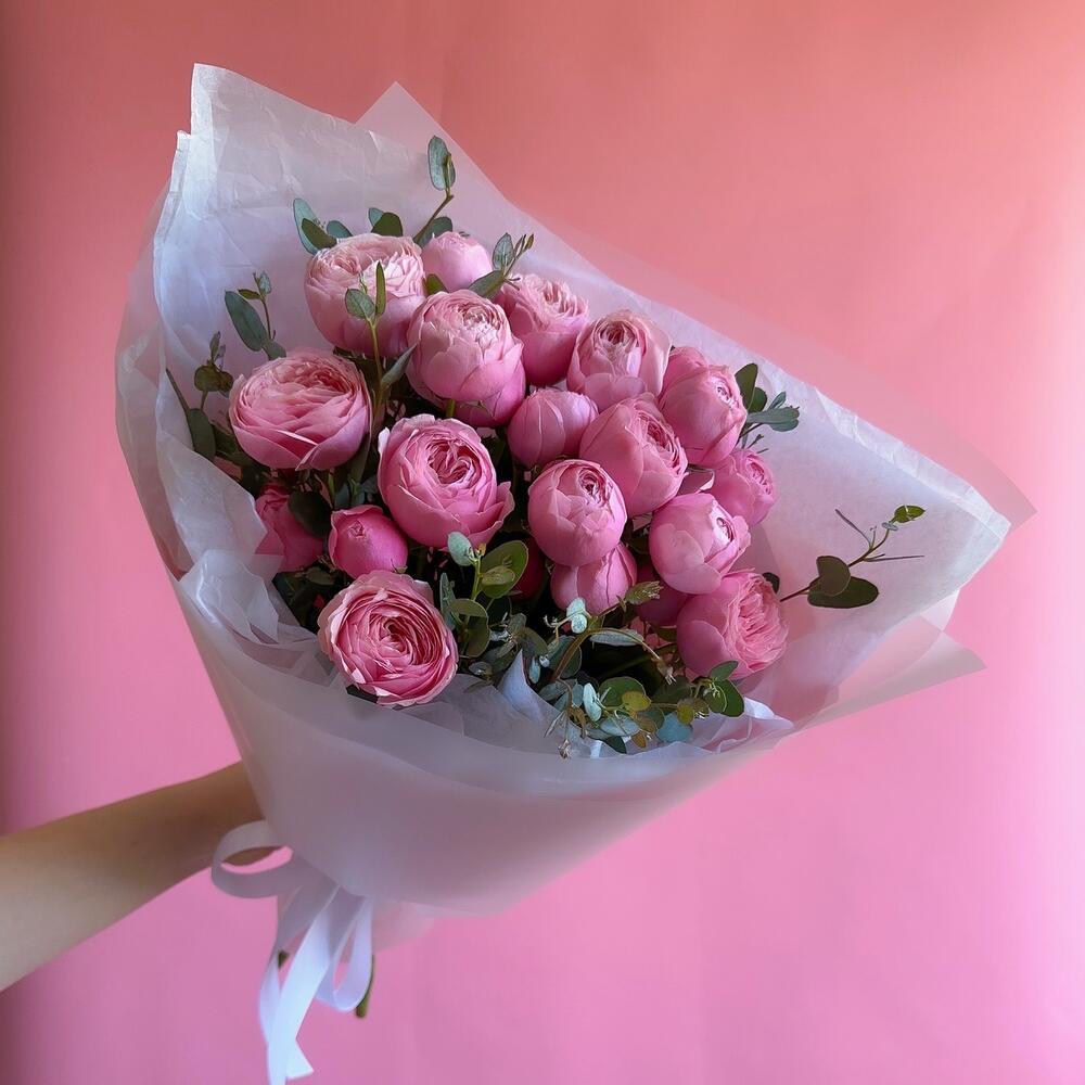 сильвия пинк кустовая пионовидная роза – 5 шт.Эвкалипт – 3 шт.Упаковка дизайнерская – 1 шт.