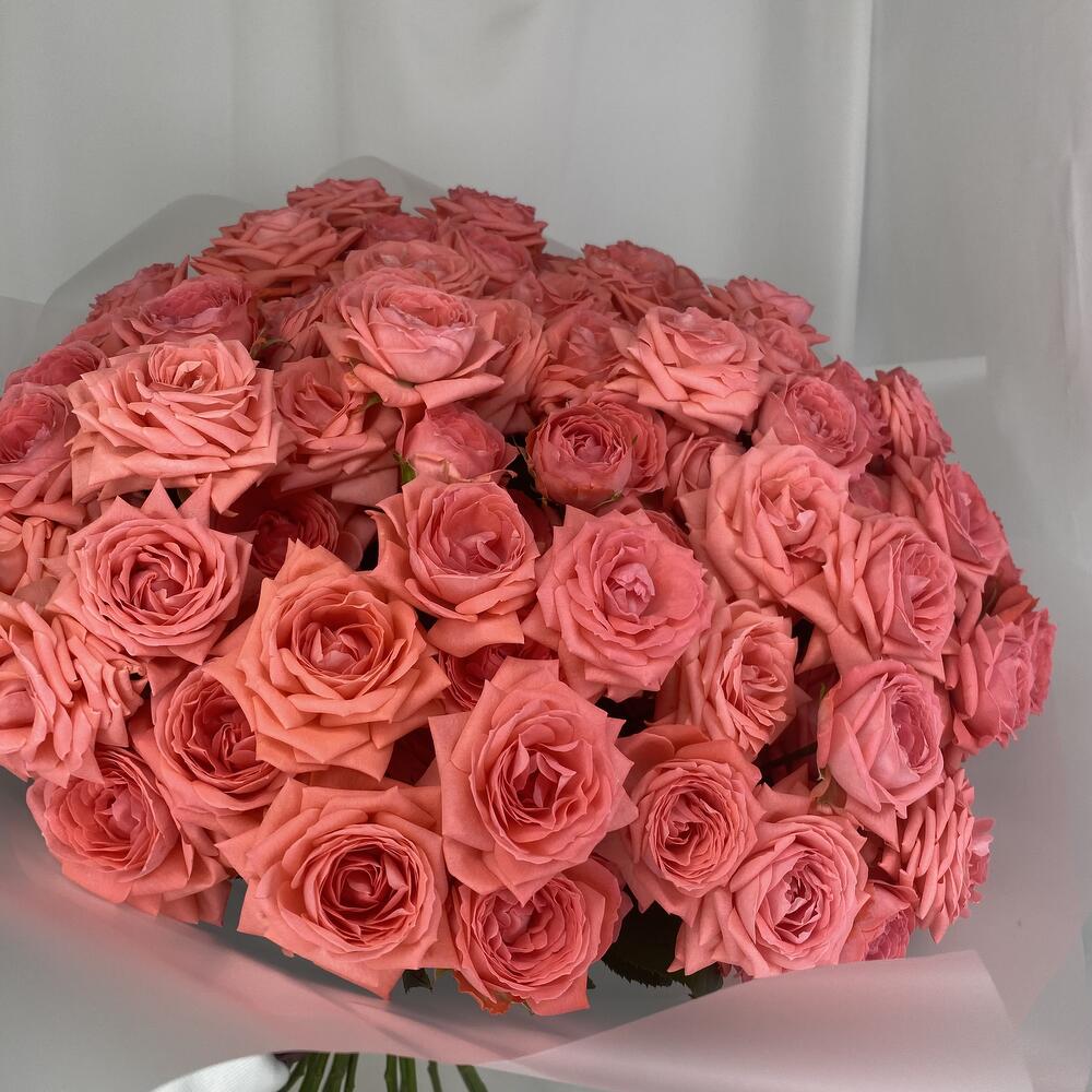Кустовая роза – 25 шт.Упаковка – 3 шт.Атласная лента – 2 шт.