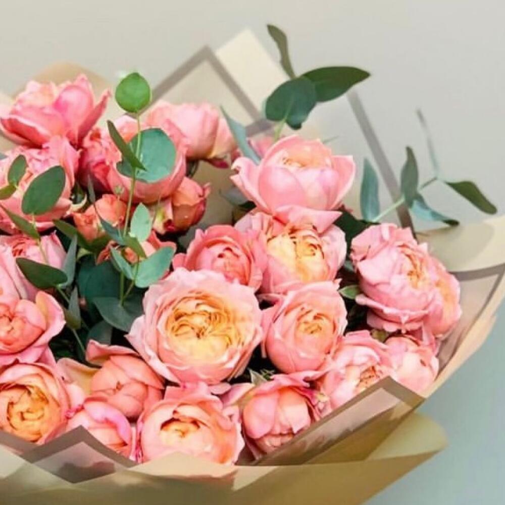 Пионовидная роза розовая – 21 шт.Упаковка дизайнерская – 1 шт.Лента атласная – 2 шт.Открытка – 1 шт.инструкция по уходу за цветами – 1 шт.хорошее настроение – 100 шт.коробка переноска – 1 шт.Кризал – 1 шт.Эвкалипт – 10 шт.