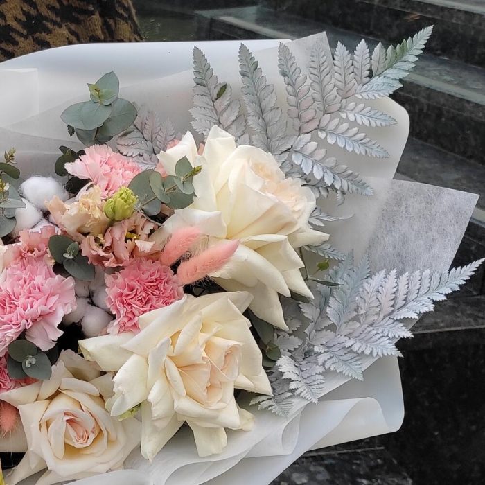 Роза пионовидная – 7 шт.Гвоздика – 7 шт.Хлопок – 5 шт.Лизиантус – 3 шт.Папоротник – 2 шт.Эвкалипт – 2 шт.Лагурус – 7 шт.Упаковка дизайнерская – 2 шт.Лента атласная – 2 шт.